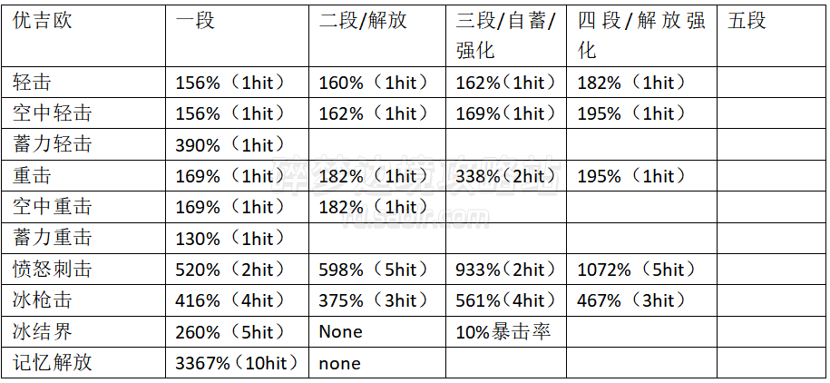 5.其他人的自动蓄力伤害提升都有700%左右,优吉欧只提升了300%(丢人欧)(这里说一下自动蓄力的提升为什么不看原倍率和增幅比例,因为自动蓄力的时间占用的是整个输出轴的时间,假如原先的输出流程是一技能接轻轻轻轻,带了自蓄之后会变成蓄力一技能轻轻,同样的时间会少几段轻击,不管原先倍率是多少,占用的时间都是一样的,所以要看绝对倍率)