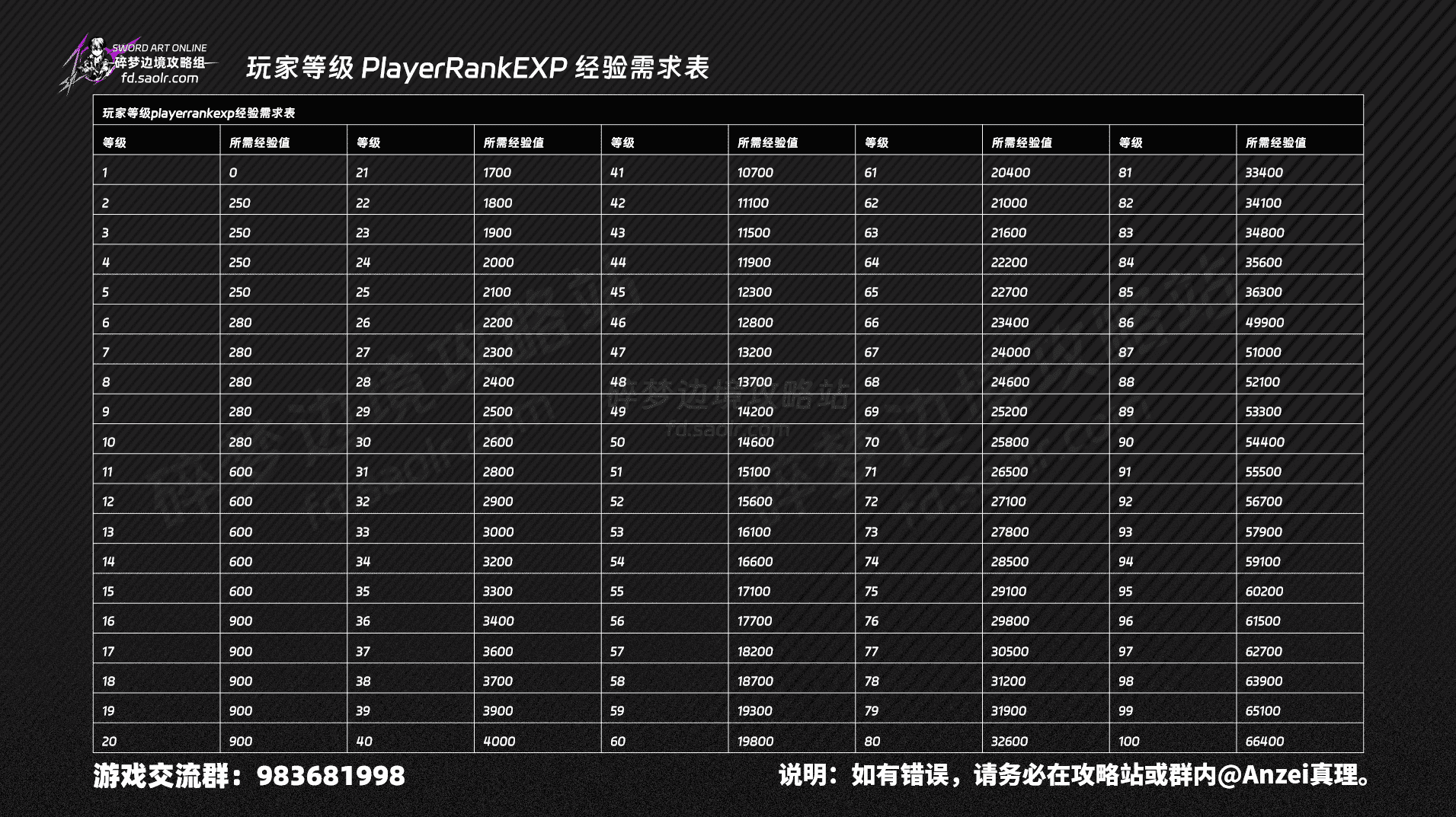 玩家等级与角色等级经验需求【SAOFD攻略数据表格】